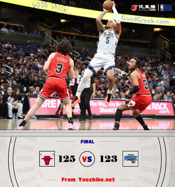 JRS直播网讯北京时间3月7日讯 NBA常规赛,魔术主场迎战公牛。魔术4连败,以29胜34负排东部第8,公牛24胜38负东部第10。上半场,两队开场便陷入缠斗,比分始终紧咬,魔术轮番冲击内线屡屡暴扣,公牛多点开花给出回应,次节双方继续对攻,公牛全民皆兵,班凯罗连造杀伤还以颜色,半场战罢公牛69-66领先魔术3分。下半场,魔术轰出17-4一度取得两位数领先,公牛多点开花扳平比分,末节双方争夺陷入白热化,关键时刻怀特内外开花连得5分,班凯罗绝杀三分不中,公牛125-123魔术险胜过关。