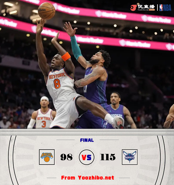 JRS直播网讯北京时间3月21日讯 NBA常规赛,尼克斯客场挑战黄蜂。尼克斯43胜25负高居东部第3,黄蜂17胜51负东部倒数第2。上半场,黄蜂率先发力打出9-2的开局,尼克斯内外开花反超比分, 黄蜂一波8-0稳住局势,次节双方围绕10分分差展开拉锯战,尼克斯不断冲击内线,黄蜂连投带罚强势回应,半场战罢尼克斯44-54落后黄蜂。下半场,黄蜂内外开花牢牢占据场上主动,尼克斯里突外投顽强追赶,末节两队继续围绕两位数的分差展开激烈争夺,黄蜂持续发力扩大优势,马威攻防两端建功,锡伯杜在比赛还剩2分钟时换下主力投子认负。最终,尼克斯98-115不敌黄蜂,客场落败。