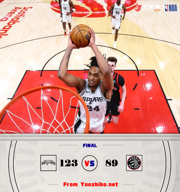 JRS直播网讯 北京时间3月24日讯 NBA常规赛今日继续开打,猛龙坐镇主场迎战马刺,这是猛龙前后8场比赛里唯一的一个主场比赛。首节对决马刺仅仅和对手拉锯半节时间就完全接管比赛,后半段猛龙在长达6分50秒里仅得6分,马刺则内外花花轰出一波25-6的攻势直接在第一节就拉开20分的巨大分差;次节猛龙虽然回归整场但无力缩小分差,马刺依靠首节建立起的优势半场拿到22分的领先。休息归来马刺延续攻势继续拉大领先,第三节再胜12分的情况下分差拉大至34分早早杀死比赛悬念。最终,马刺客场大胜猛龙拿下比赛。