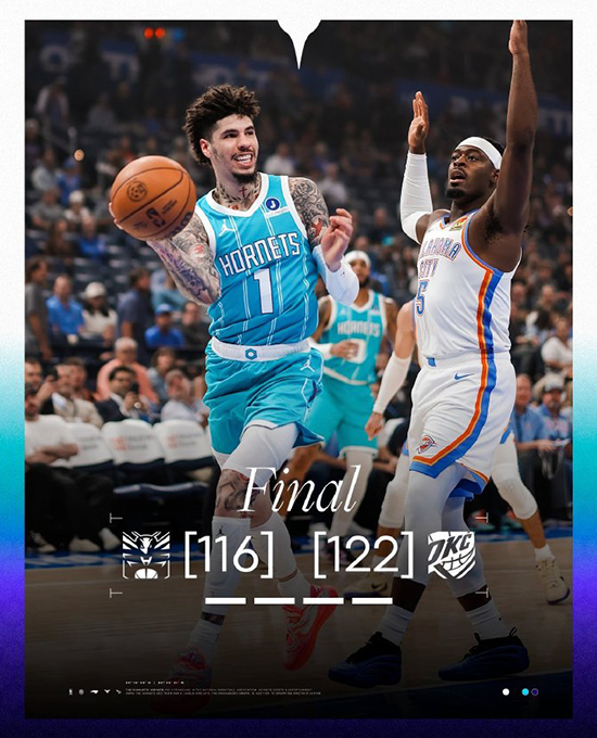 JRS直播网讯 北京时间10月10日 NBA季前赛,俄克拉荷马雷霆对阵夏洛特黄蜂。半场雷霆64-57黄蜂,最终雷霆122-116黄蜂。