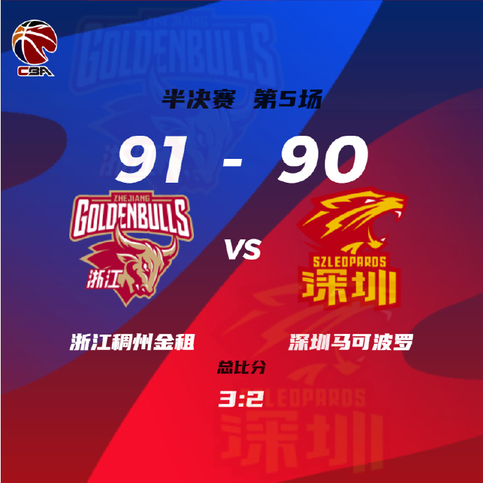 JRS直播网5月4日讯 CBA季后赛半决赛,浙江回到主场迎战深圳,两队上一场比赛上演精彩的绝杀与反绝杀,依靠程帅澎压哨三分的绝命一击,浙江涉险将大比分扳成2-2,将比赛拖到主场抢5。本场比赛,沈梓捷因伤缺战。双方上来状态不错,程帅澎延续上一场三分绝杀的火热状态,深圳则是靠萨林杰撑起进攻,随后全民皆兵的浙江抓住深圳接连失误打出12-0攻击波一举确立领先,但最后3分钟连续失误被深圳追分。次节双方增加防守强度,各种倒地频出,深圳一度反超比分,但很快浙江稳定情绪一波9-0稳住局势,白昊天压哨三分,深圳半场落后5分。下半场,浙江进攻端突然断电,还连续出现失误半节时间仅得2分,深圳连续反击加造杀伤打出15-0超级进攻波一举反超到近10分,吴前带领浙江开始追分,末节浙江一波15-4攻击波又反超回来,双方展开拉锯战,萨林杰关键三分再次反超1分,程帅澎空切上篮给出回应,贺希宁三分绝杀不中,最终浙江91-90险胜深圳,大比分3-2晋级总决赛。