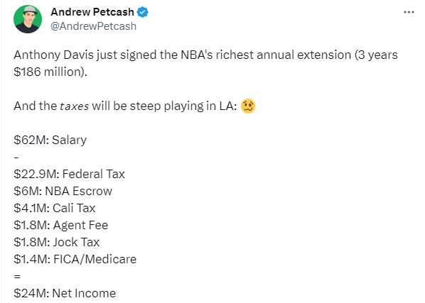 美记者Andrew Petcash发推列出浓眉3年1.86亿美元新合同的交税分布、相关费用和净收入金额——