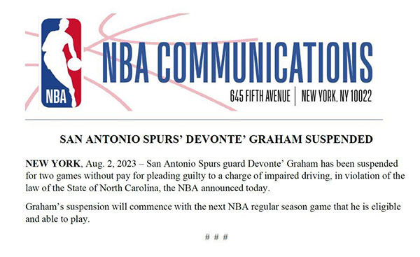 JRS直播网讯08月03日据著名NBA记者沙姆斯-查拉尼亚报道,马刺球员德文特-格拉汉姆因为酒驾而被NBA官方禁赛两场。