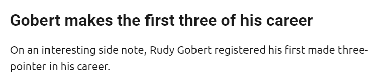 戈贝尔赛后表示:“每一年我的信心都在增强,我已经达到可以在比赛中投进三分的水平,我的队友也信任我,我会继续出手的。大多数球迷不知道球场以外的事情,他们可能会惊讶于此,但在球场上展示之前,你必须在场下足够努力。”