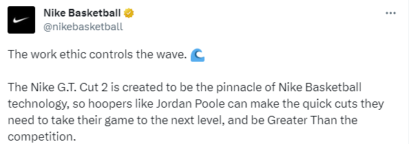 耐克官方声明:职业道德控制着这股浪潮,耐克GT Cut 2旨在成为Nike篮球技术的巅峰之作,因此像Jordan Poole这样的篮球运动员可以快速切入,将比赛提升到一个新的水平,并超越竞争对手。