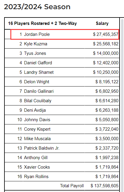 今夏普尔在勇士和奇才5换1大交易中被送到华盛顿,新赛季他将身穿奇才13号球衣开启生涯新篇章;另外奇才今夏把比尔交易到太阳,把波尔津吉斯交易到凯尔特人,一番操作过后,普尔已经成为现在奇才队年薪第一人,新赛季普尔年薪2745万美元,力压库兹马成队内薪水最高的球员。