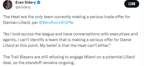 NBA记者Evan Sidery也表示开拓者仍然拒绝与热火就利拉德的潜在交易进行会面谈判,因此僵局仍在继续;此前Chris Haynes曾透露,开拓者和热火原计划在七月早些时候于拉斯维加斯会面,但这次会面最终没有进行。