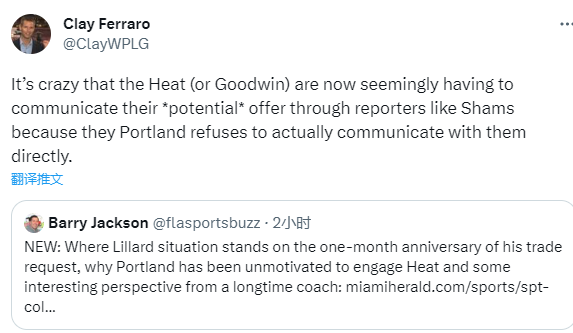 据热火记者Clay Ferraro透露,热火队或古德温现在似乎不得不通过像shams这样的记者传达他们的“潜在”报价,这太疯狂了,因为波特兰拒绝与热火直接沟通。