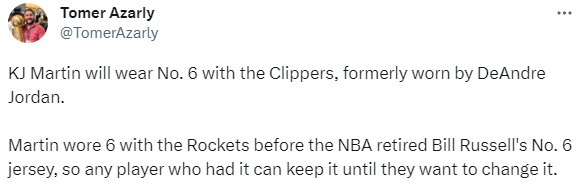 小马丁在快船将继续身披6号,上一位在快船身披6号球衣的球员是小乔丹。快船记者Tomer Azarly还解释道:小马丁是在比尔-拉塞尔去世前穿的6号球衣,因此他可以选择继续穿这个号码。