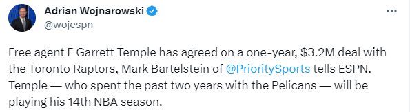 来源:JRS直播网08-01 09:11JRS直播网讯08月01日,据espn名记woj报道,37岁的自由球员加勒特-坦普尔和猛龙签下1年320万合同,开启生涯第14个赛季以及迎来生涯第12支球队。