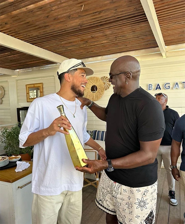 此前布克仅仅晒出乔丹搂着他的背面照,今天布克则是晒出两人开怀大笑的正面照——布克身穿白色T恤、戴着棒球帽,拿着一瓶酒与乔丹开怀畅聊;60岁的乔丹则戴着墨镜、身穿黑色T恤,摸着酒瓶的底部,和布克一起咧嘴大笑。