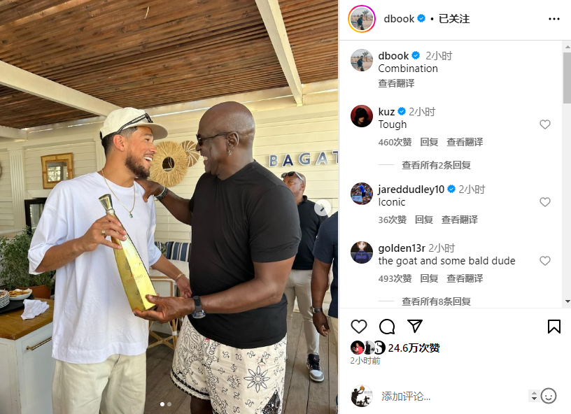 据悉,布克是在意大利度假时遇到乔丹的,两人勾肩搭背并且都咧嘴大笑,美媒调侃布克应该向乔丹请教一些技巧,毕竟乔丹对夺冠很有心得。