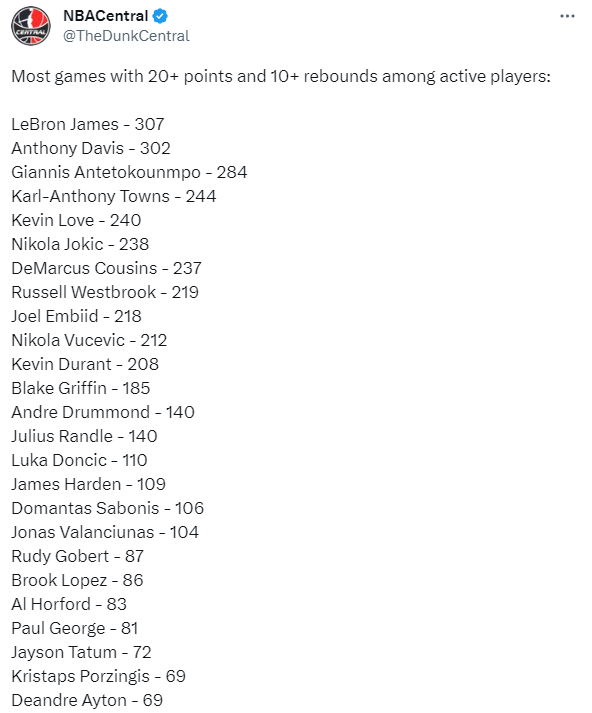 现役球员20+10场次榜:詹皇联盟第一浓眉第二 杜兰特无缘前十