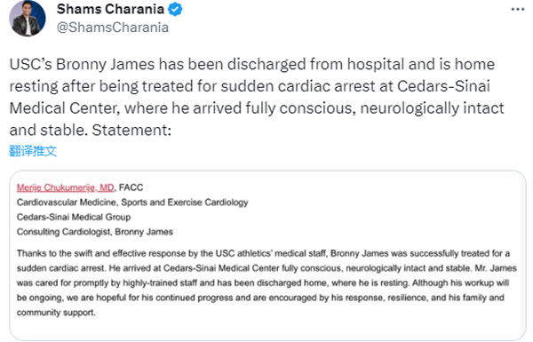 “感谢南加大体育医疗团队人员迅速、高效地做出了应对,布朗尼-詹姆斯的心脏骤停得到了成功的治疗。当他被送到Cedars-Sinai医疗中心时意识完全清醒,神经系统完好且处于稳定的情况。在住院期间,布朗尼得到了受过专业培训的医护人员的妥善照料,现已返回家中休息。尽管对他的检查仍会继续进行,但我们对他的持续进展充满希望,并被他的反应、复原力以及他的家人们和社区所给予的支持鼓舞到。”