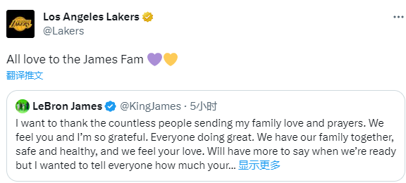 湖人官方转发詹姆斯的推文,并写道:所有的爱都献给詹姆斯的家人。