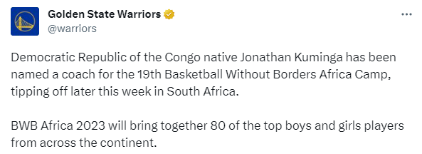 勇士官方宣布前锋乔纳森-库明加将会担任第19届篮球无国界非洲训练营的教练,本次训练营将在南非进行,总计将会有80名青少年球员参与。