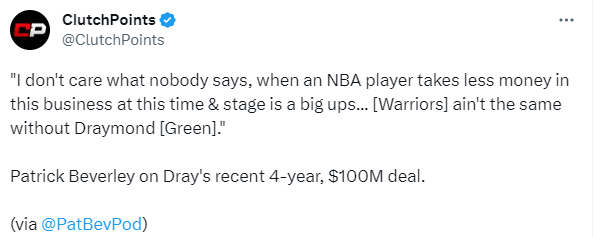 谈到格林和勇士续签4年1亿美元的合同,贝弗利表示:他为勇士大幅降薪了,我不管别人说什么,NBA球员在现在这个大合同满天飞的时代还会选择降薪,值得称赞,勇士没有他就不一样了。