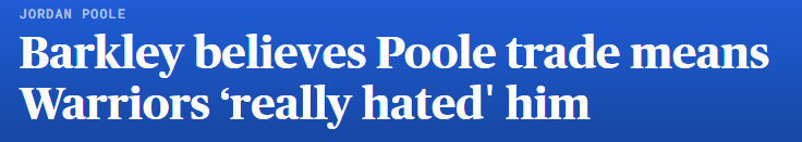 对于勇士交易普尔,NBA名宿巴克利在节目中表示:他们讨厌他,我看到消息之后第一反应就是:他们真的讨厌乔丹-普尔。但这对普尔来说也是一个重新开始的机会,他经历过巅峰也经历过低谷,所以他需要一个全新的开始,我希望这能奏效。