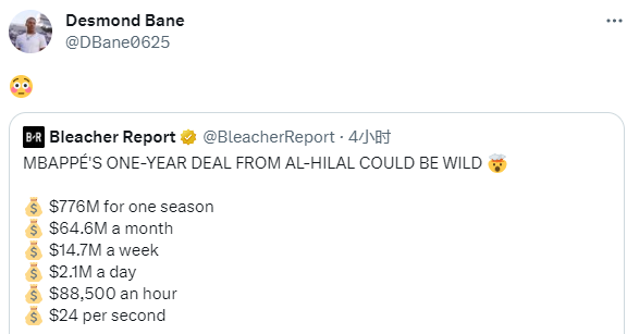 开拓者球星利拉德发推惊呼1年7.76亿美元;灰熊球星贝恩也惊呆了,他今夏和灰熊提前续签5年2.07亿美元的大合同;美媒《露天看台》详解姆巴佩天价合同——一个赛季7.76亿美元,每月6460万美元,每周1470万美元,每天210万美元,每小时88500美元,每秒24美元。