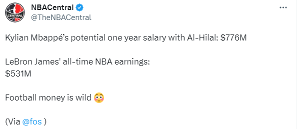 美媒NBACentral发推:姆巴佩在利雅得新月的一年潜在薪水为7.76亿美元,而詹姆斯的NBA职业生涯总薪资是5.31亿,足坛薪资太狂野。