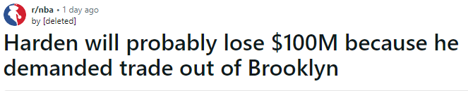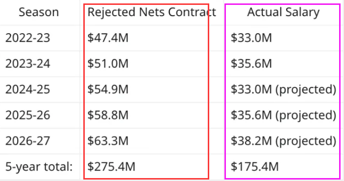 据报道,哈登本有可能在2022年休赛期和篮网签下5年2.75亿美元的顶薪合同,可他离开篮网并且加盟76人后,去年夏天降薪和76人签下2年6800万美元的廉价合同,哈登已经执行球员选项,明夏将成为自由球员,但预计哈登未来几年的年薪都不会超过4000万美元,如此一来,哈登离开篮网后的5年最多获得1.75亿美元(且不保险),比留在篮网至少损失1亿美元。