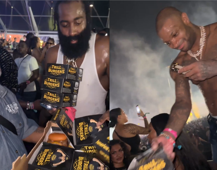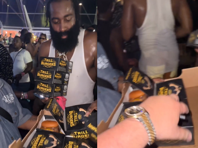 在视频中,哈登穿着白色小背心和短裤,戴着大金链子现身,现场很多人都随着音乐摇摆;可能是玩累了,满身大汗的哈登拿走四个汉堡,扭头回到自己的位置,大胡子的背心都湿透了;PJ-塔克赤膊出镜,也要了一个汉堡。