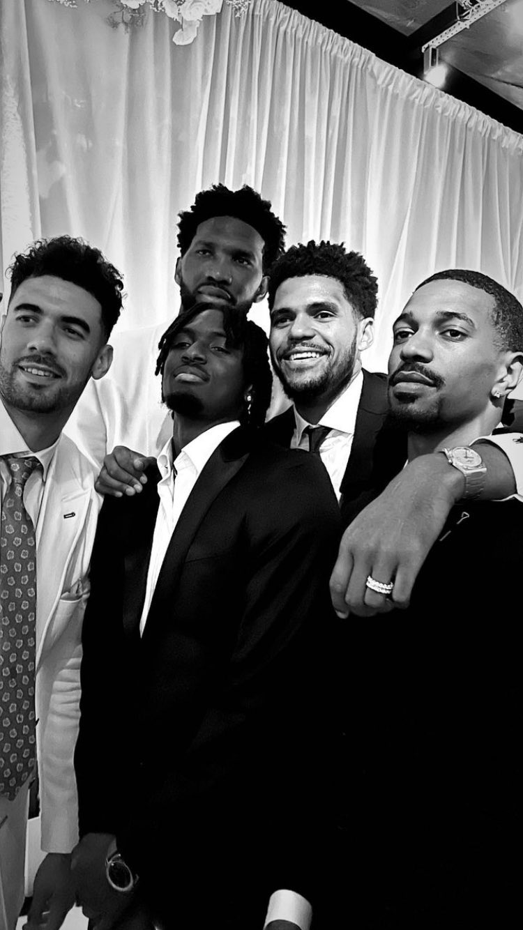 究竟有哪些NBA球员参加了恩比德的婚礼?据美媒报道,76人球员哈里斯、马克西和梅尔顿来到现场,恩比德的前队友乔治-尼昂(目前效力骑士队)也来了,他们五人合影留念。