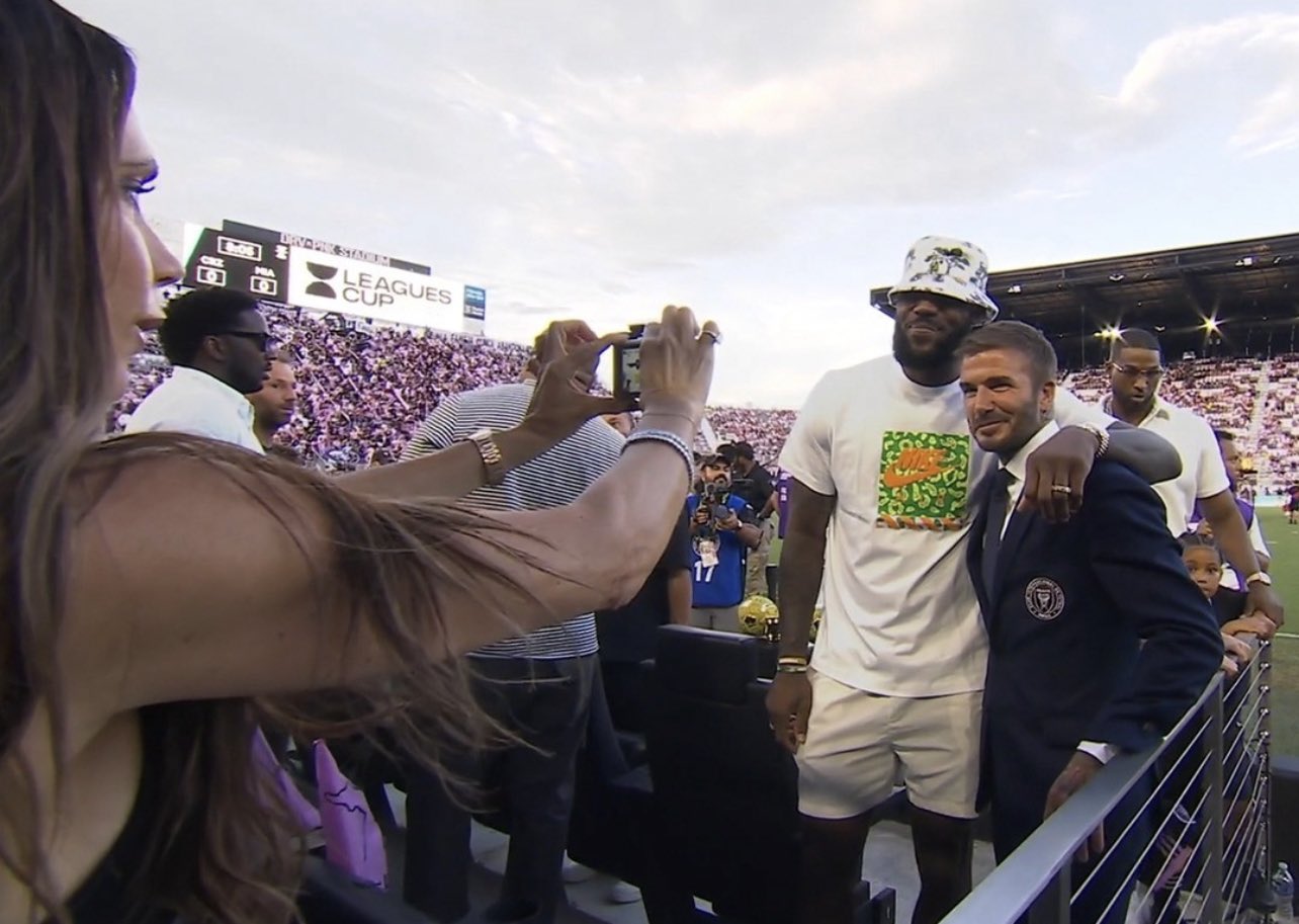 詹姆斯还和贝克汉姆夫妇合影,以及搂着贝克汉姆拍照,老詹满脸笑容十分开心,不得不说,梅西美职联首秀轰动世界,足篮梦幻联动,詹姆斯、贝克汉姆都来观战;美媒更是发问一个视频中有多少个GOAT(历史最佳)?