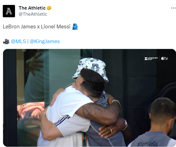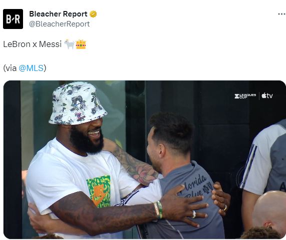 38岁的詹姆斯身穿短裤和白色T恤、带着一顶小白帽来到现场;在梅西迎来迈阿密国际首秀赛前,詹姆斯和梅西深情亲密拥抱,两人抱在一起很久,而且拥抱了两次,两人深情拥抱开心热聊一幕引美媒刷屏转发,直呼国王和goat。