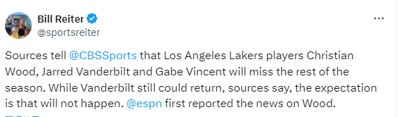 今日名记报道文森特、伍德和范德比尔特都将因伤赛季报销。