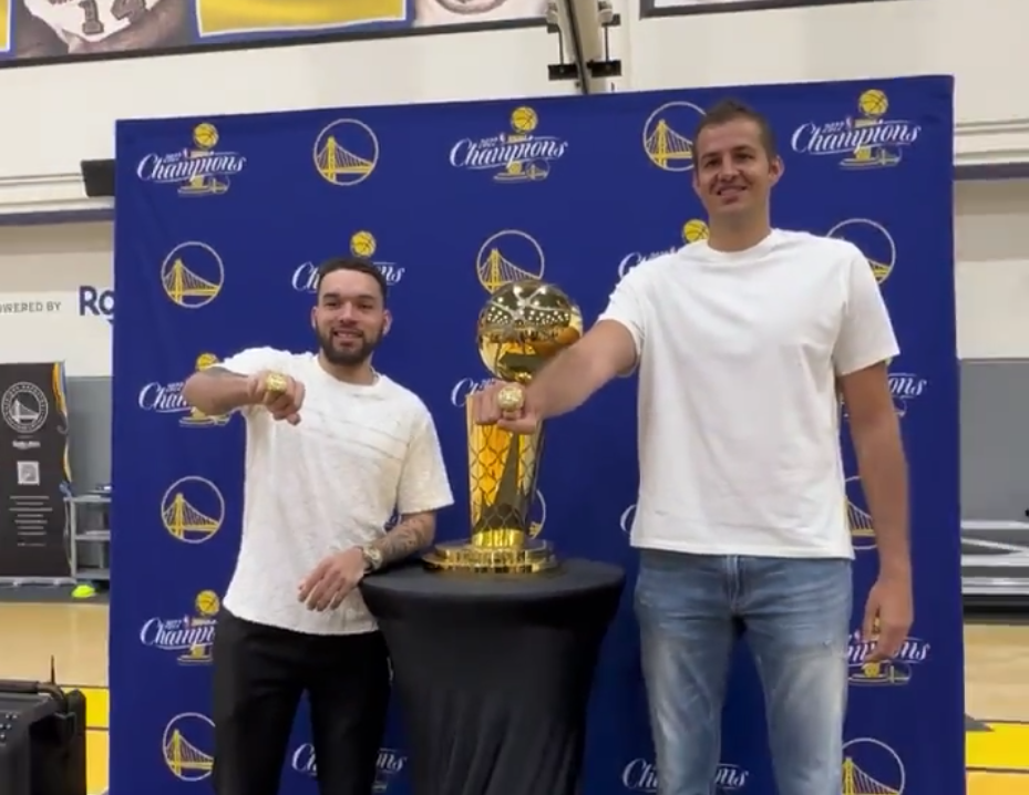 今日,奇奥萨和别利察来到勇士训练馆参观青少年训练营,勇士队为他们举行颁发戒指的仪式,小球迷为他们送上戒指,奇奥萨和别利察都十分开心,冲着镜头展示总冠军戒指,现场球迷为他们鼓掌欢呼;奇奥萨和别利察戴着戒指和总冠军奖杯合影。