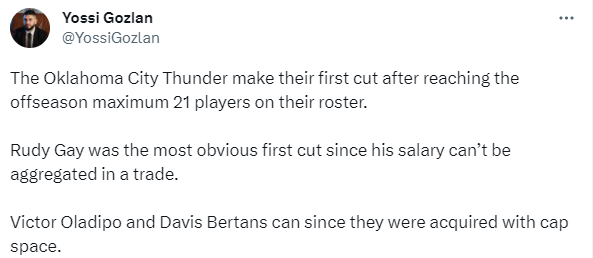 随着雷霆签下欧冠MVP米西奇,雷霆队新赛季大名单达成21人,这是雷霆决定裁掉盖伊的原因之一。薪资专家Yossi Gozlanz表示雷霆队大名单超过上限,盖伊被裁时因为他的薪水无法在交易中相加,奥拉迪波和贝尔坦斯的薪水都可以用于交易。