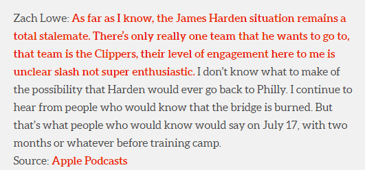 此前shams曾报道哈登与76人高管之间的关系破裂,他只想被交易到快船。