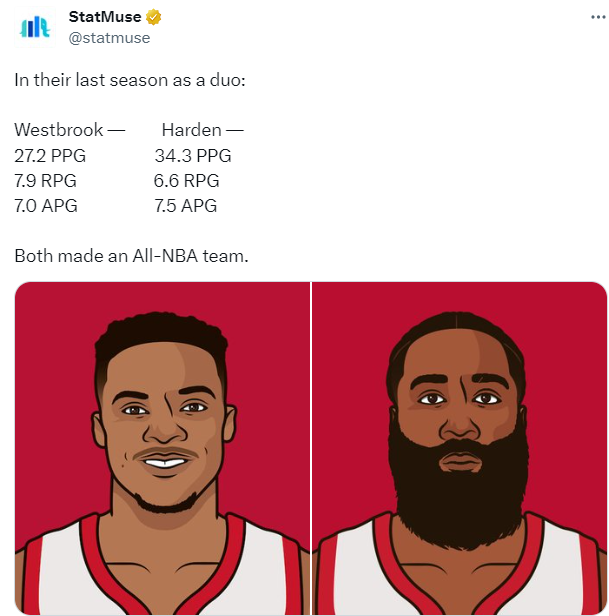哈登渴望与威少重聚,他们曾在火箭联手过,当时威少场均拿到27.2分7.9篮板7助攻,哈登则是场均轰下34.3分6.6篮板7.5助攻,但登威仅在火箭合作一年就分道扬镳了。