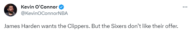 名记kevin Oconnor报道,哈登想要被交易到快船,但76人不喜欢他们的报价。
