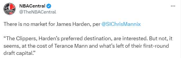 据体育画报记者Chris Mannix报道,哈登的首选球队快船队当然对他感兴趣,但似乎这种兴趣不是以牺牲特伦斯-曼恩和他们所剩无几的首轮选秀权为代价的;换言之,快船拒绝在哈登交易中送走曼恩和首轮签。