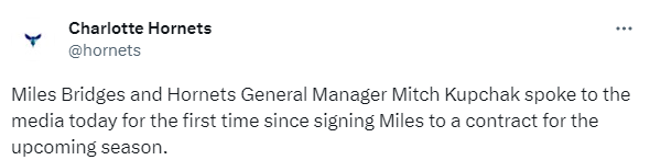 黄蜂队篮球运营总裁兼总经理米奇-库普切克出席了发布会,他表示:延长资质报价的决定花了很多时间来解决,球队老板和管理层进行了深思熟虑,自从去年11月以来,布里奇斯一直遵循洛杉矶当地检察官规定的条件。
