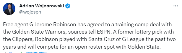 来源:JRS直播网07-18 12:26JRS直播网讯07月18日,据espn名记woj报道,NBA自由球员杰罗姆-罗宾逊已同意与金州勇士队达成训练营协议,他将争夺勇士队的一个空缺名额;罗宾逊曾是快船队的乐透秀,过去两年效力于勇士发展联盟的圣克鲁兹队。