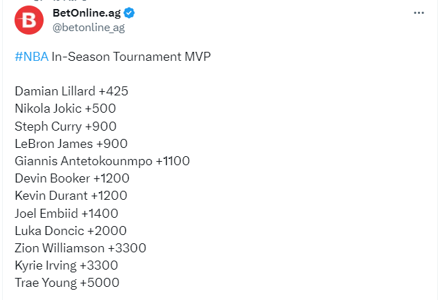 来源:JRS直播网07-18 07:45JRS直播网讯07月18日,2023-24赛季,NBA将在常规赛阶段举办第一届季中锦标赛,在这样的情况下,美媒公布首届锦标赛MVP赔率,利拉德榜首,詹姆斯和库里并列第三,锡安上榜。