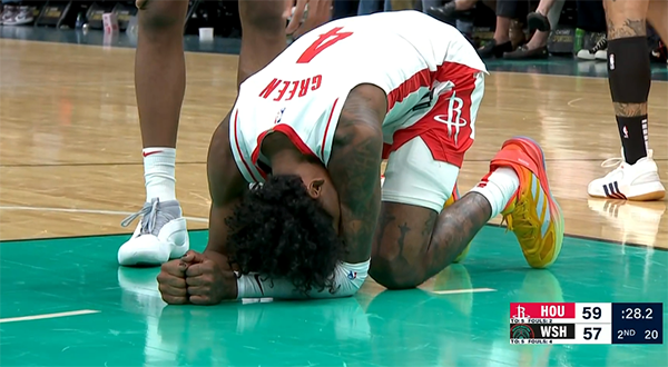 客场对阵奇才,杰伦-格林早早开启进攻模式,开场5中5连得14分,第一节9中6爆砍19分;第二节格林依靠造杀伤拿到3分,比赛期间,格林突破时撞到面部,痛苦倒地,所幸身体无碍,继续比赛;下半场,格林第三节再次大爆发,单节7中5独揽15分,超级大回环拉杆2+1太疯狂;末节贡献5分并且早早打卡下班,与队友庆祝胜利。