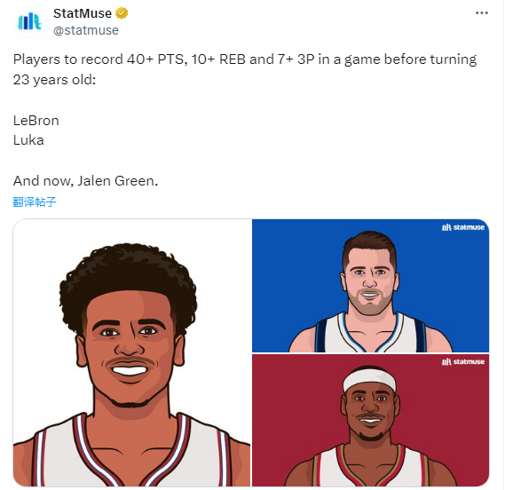 3、22岁格林比肩詹姆斯和东契奇,成为历史上第三位在23岁之前单场至少40分10篮板且命中7记三分的球员