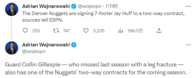 据名记Woj报道,掘金队和2米16中锋杰-胡夫签下一份双向合同签;22-23赛季,胡夫为骑士出战7场比赛,场均能够得到7.3分3篮板1.4助攻;21-22赛季,胡夫为湖人打了4场比赛,场均上场5分钟仅贡献0分1篮板。
