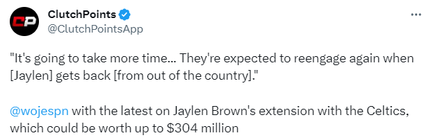 ESPN名记Woj在节目中表示,布朗和凯尔特人距离签约完成还要再等一段时间,杰伦以及他的经纪人一直在和凯尔特人谈判。现在杰伦出国参加球员工会的活动了,等他回来之后,他们预计会重启谈判。这将是NBA建立至今最大的合同,总金额达到3.04亿,最后一年薪水达到7000万。