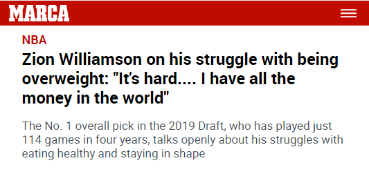 来源:JRS直播网07-15 11:35JRS直播网讯07月15日,近期鹈鹕球星锡安-威廉斯接受了马卡报的采访,期间他谈到了自己的体重问题,并公开谈论了自己在健康饮食和保持体型方面的挣扎状况,直言:我太有钱了,控制体重太难了。