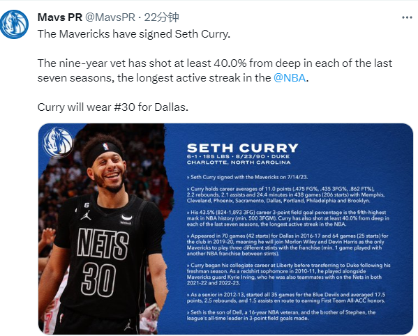 独行侠官宣签下塞斯-库里,据悉,他们双方签下2年合同,赛斯的年薪超过400万美元,赛斯的哥哥是勇士巨星斯蒂芬-库里。