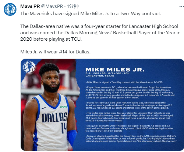 独行侠正式宣布用双向合同签下小迈克-迈尔斯,后者是达拉斯本地人,四年高中生涯全都首发,2020年被达拉斯晨报评为年度最佳篮球运动员。