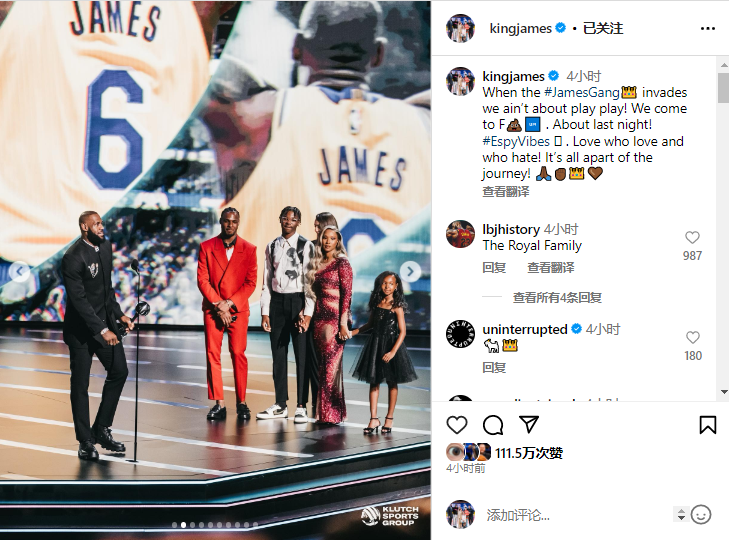 今日詹姆斯晒出多张领奖的现场照,配文写道:当詹姆斯家族入侵,我们不是来闹着玩的!我们来了,关于昨晚的ESPY颁奖典礼,不管你是爱还是恨,这都是旅程的一部分!