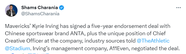 安踏官宣签约欧文: 双方达成5年合同 独行侠球星今夏第二份肥约到手