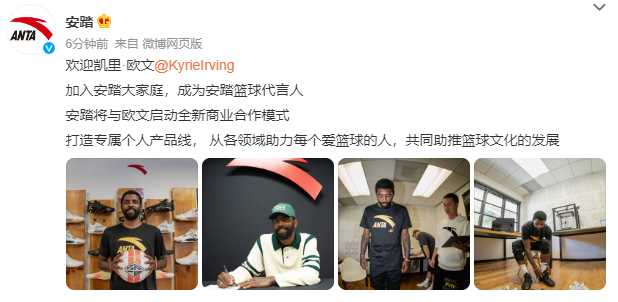 安踏官宣签约欧文,更新社媒并且晒照写道:加入安踏大家庭,成为安踏篮球代言人;安踏将与欧文启动全新商业合作模式;打造专属个人产品线, 从各领域助力每个爱篮球的人,共同助推篮球文化的发展。