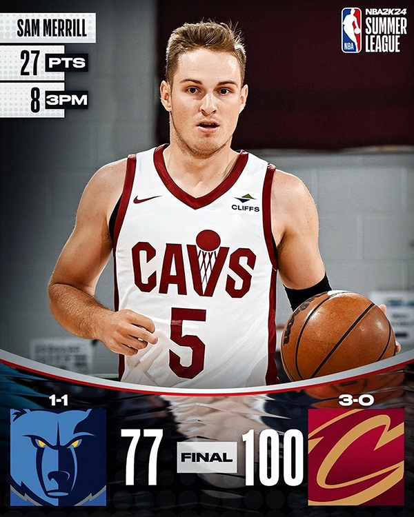 来源:JRS直播网07-11 12:51JRS直播网讯07月11日,在NBA夏联骑士100-77大胜灰熊的比赛中,骑士首发后卫萨姆-梅里尔打出疯狂一战,全场出战21分钟,13投9中、三分11中8狂砍27分2篮板2助攻1抢断;米切尔、加兰等人观战,贝茨也打出高效一战。